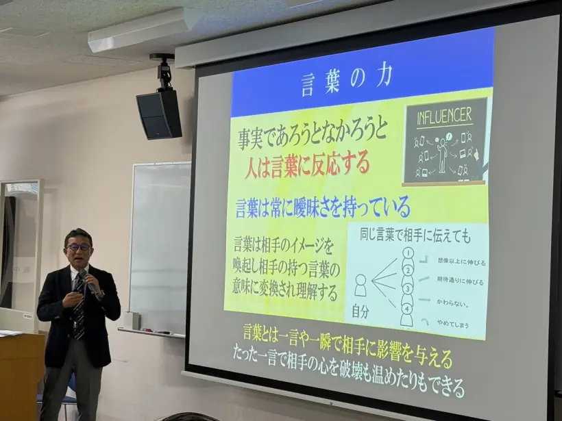 続いて、木林キャリアカウンセラーによる「マナー・コミュニケーション講座」が行われ、学生たちは社会人基礎力としてのマナーや対人スキルについて学びました。